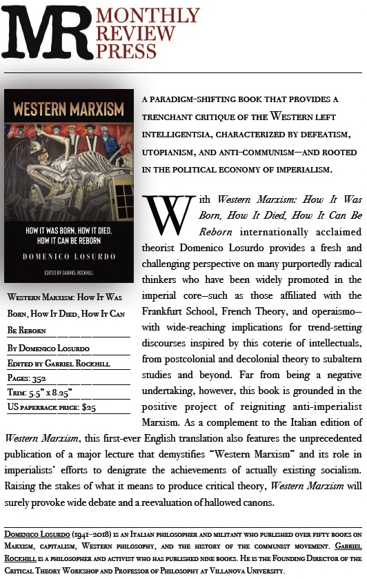 I’m thrilled to announce that this book, which has been a long time in the making, will be out on August 1. In addition to Losurdo’s seminal work, it includes an introduction that I co-authored with Jennifer Ponce de León and the first publication of an important lecture by Losurdo on Western Marxism.